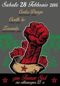 Ore 21:00 Cena popolare Ore 23:00 Inizio concerti: Carlos Dunga(trash soccer punk Firenze) Orsetti hc(hardcore Padova) Zeromila(hardcore melodico Padova)