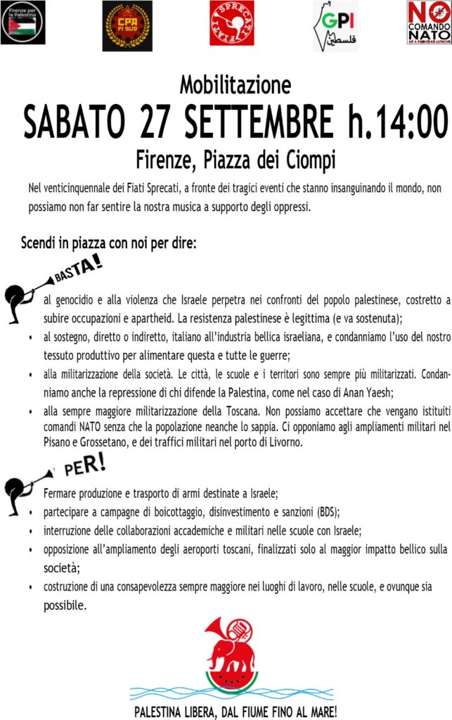 Dopo lo sciopero e la mobilitazione di ieri con il corteo partito dalla rotonda all’uscita dell’A1 di Calenzano, Sabato 27 Settembre alle ore 14.00 in piazza de’ Ciompi si torna in strada per la Palestina, contro il genocidio, la NATO, il riarmo e la guerra.