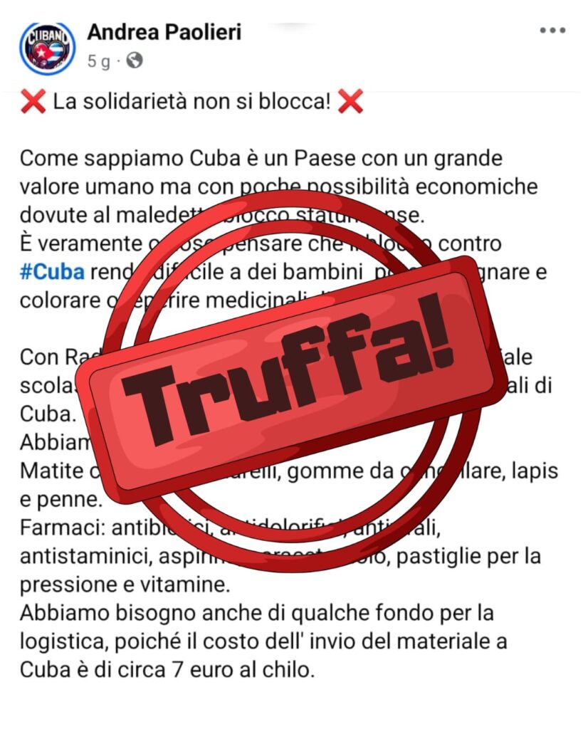 Oggi Andrea Paolieri torna a chiedere soldi “per Cuba” sfruttando la lotta e la solidarietà contro il blocco: chiede di versarli direttamente sul suo conto personale.