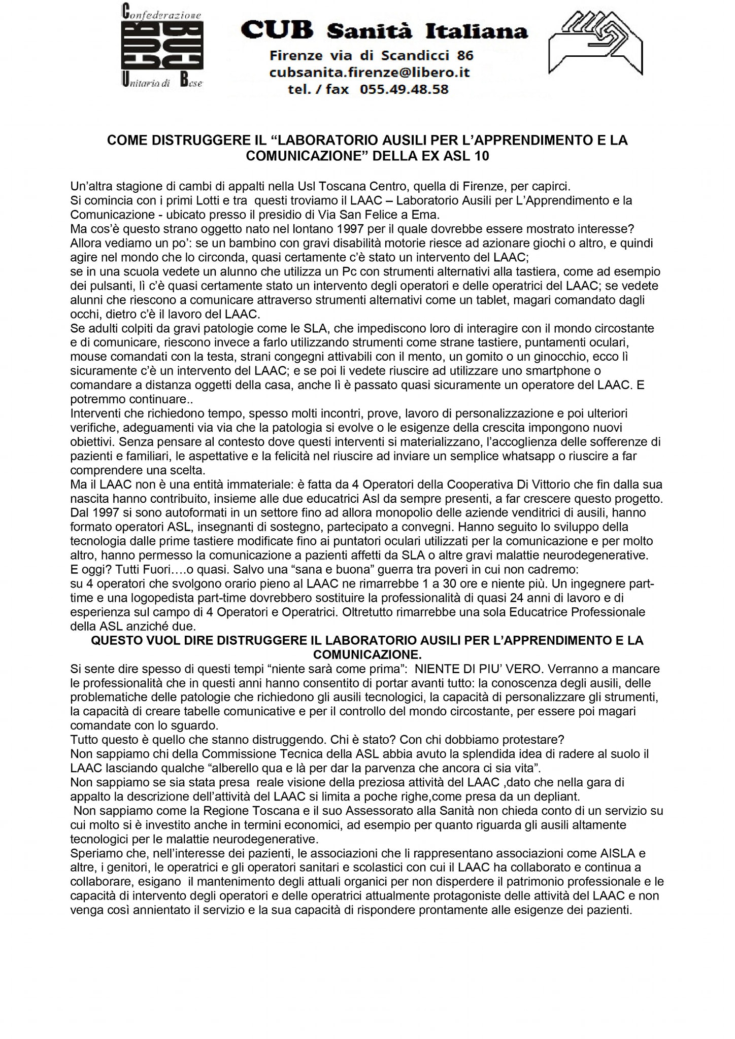 Pubblichiamo il comunicato della Cub Firenze.