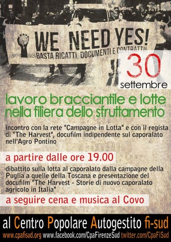 Venerdì 30 SettembreLavoro Bracciantile:le lotte nella filiera dello sfruttamentoLeggi tutto »Venerdì 30 SettembreLavoro Bracciantile:le lotte nella filiera dello sfruttamento