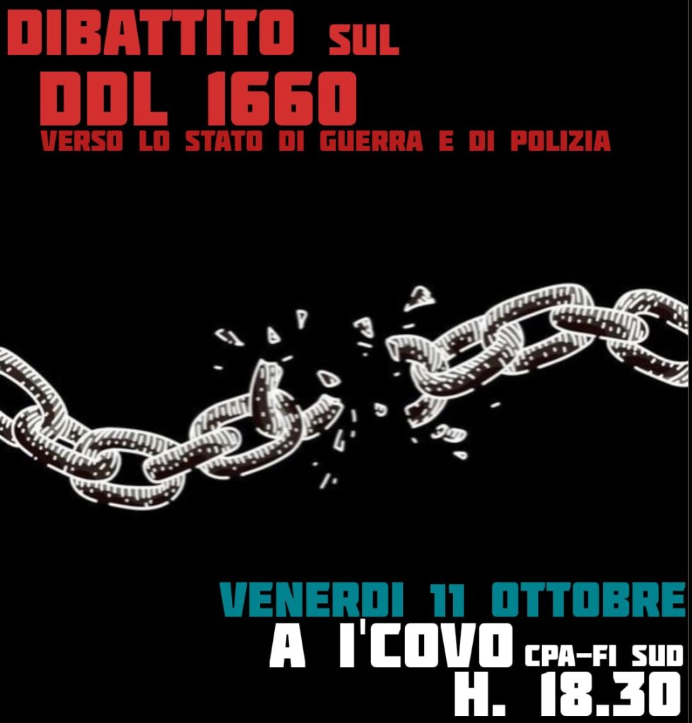 Venerdì 11 Ottobre dalle 18:30 discuteremo insieme del decreto 1660, del suo impatto sulle lotte e di come organizzarci per combatterlo.