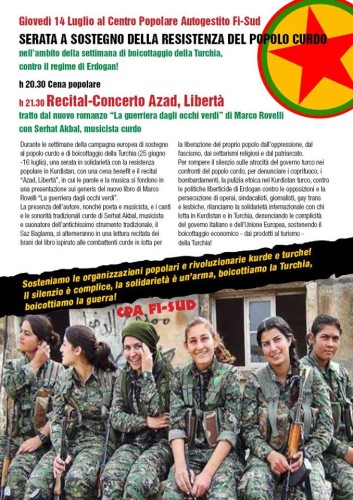 Durante le settimane della campagna europea di sostegno al popolo curdo e di boicottaggio della Turchia (25 giugno-16 luglio), una serata in solidarietà con la resistenza popolare in Kurdistan, con una cena benefit e il recital “Azad, Libertà”, in cui le parole e la musica si fondono in una presentazione sui generis del nuovo libro di Marco Rovelli “La guerriera dagli occhi verdi”. La presenza dell’autore, nonché poeta e musicista, e i canti e le sonorità tradizionali curde di Serhat Akbal, musicista e suonatore dell’antichissimo strumento tradizionale, il Saz Baglama, si alterneranno in una lettura recitata dei brani del libro ispirato alle combattenti curde in lotta per la liberazione del proprio popolo dall’oppressione, dal fascismo, dai settarismi religiosi e dal patriarcato.
