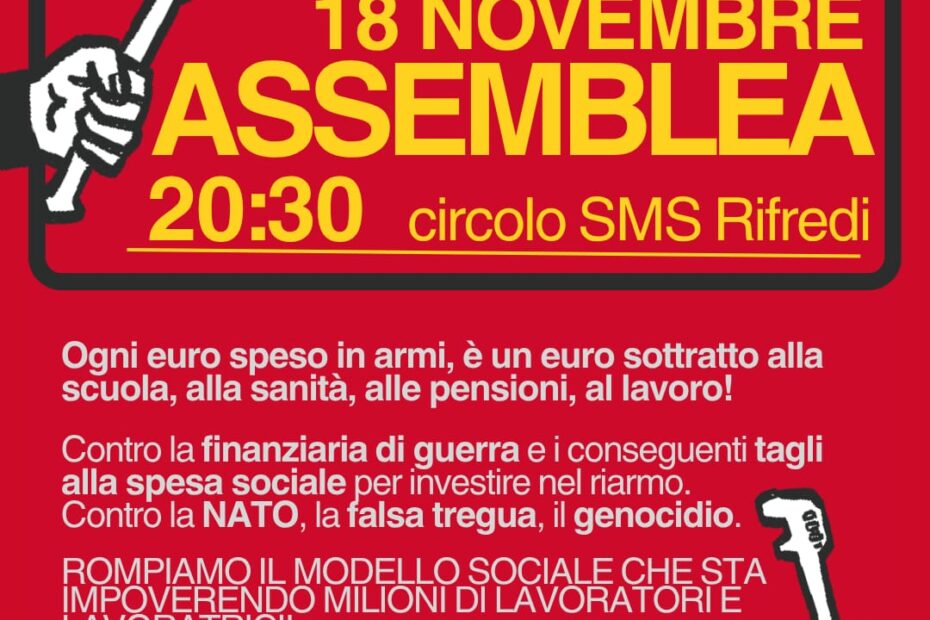 Dopo l’organizzazione delle manifestazioni per gli scioperi generali del 22 Settembre alla rotonda di Calenzano e del 3 Ottobre alla Fortezza, l’Assemblea per lo Sciopero lancia l’appuntamento del 18 Novembre in vista dello sciopero generale del 28.