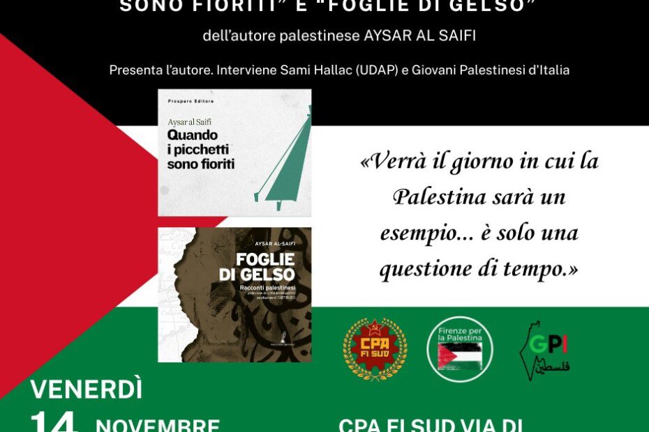 «Verrà il giorno in cui la Palestina sarà un esempio… è solo una questione di tempo.» Presentazione dei libri “Quando i picchetti sono fioriti” e “Foglie di Gelso”. Presenta l’autore palestinese Aysar Al Saifi, interviene Sami Hallac (UDAP) e Giovani Palestinesi d’Italia
