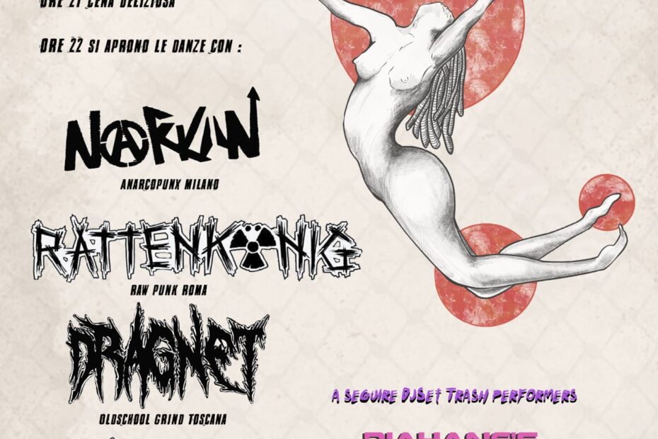 sabato 28 Giugno @ 17:30 Dalle ore 17:30 live painting + a seguire asta benefit Ore 20:30 cena sociale Ore 21:30 inizio live con Dragnet (oldschool grind Toscana) Rattenkonig (raw punk Roma) Narkan (anarcopunx Milano) A seguire dj set performers Diahane’s Angels (Mel Isis, Uma Trauma, Elena di Troya) L’intero incasso della giornata andrà benefit al compagno Ghespe attualmente imprigionato […]
