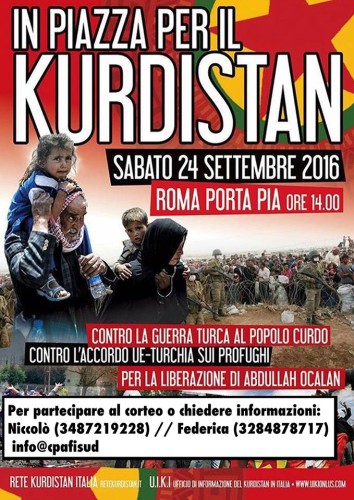 Il 24 settembre a Roma si terrà la Manifestazione nazionale per il Kurdistan, convocata dall’Ufficio Informazione del Kurdistan in Italia e da Rete Kurdistan Italia, le realtà solidali con la resistenza kurda. Una manifestazione in solidarietà con le esperienze di autogoverno e in sostegno alla sinistra kurda, in lotta contro l’oppressione turca da oltre 40 anni. Anche noi da Firenze saremo in piazza a Roma, per denunciare la repressione del regime di Erdogan, l’invasione turca della Siria e i legami militari ed economici di Italia e UE con lo stato turco, e allo stesso tempo in sostegno alla sinistra rivoluzionaria kurda e turca, contro la guerra alimentata dagli interessi dei paesi occidentali nell’area.