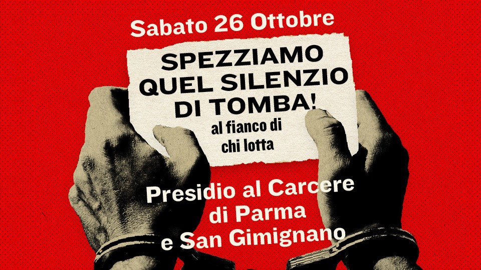 In questo momento riteniamo sia di fondamentale importanza portare tutta la solidarietà possibile ai detenuti di San Gimignano. Per questo sabato 26 ottobre andremo sotto le mura di quel carcere, in contemporanea con il presidio che si svolgerà sotto il carcere di Parma per ricordare Egidio Tiraborrelli, operaio in pensione ucciso a 82 anni, dopo essere stato condannato in contumacia per favoreggiamento dell’immigrazione. Pur gravemente malato, gli sono stati rifiutati i domiciliari e così è uscito dal carcere solo per andare nell’ospedale dove alla fine è deceduto. Lo faremo contro l’inferno dei cosiddetti “regimi differenziati”: le sezioni di massima sicurezza (41bis) e di alta sicurezza (AS) che sottopongono i prigionieri ad un trattamento che costituisce una vera e propria tortura. Lo faremo in solidarietà con tutt@ i compagn@ che si ritrovano prigionieri o sotto processo per le lotte contro questo stato che violenta, tortura e uccide ogni giorno attraverso i suoi servi. Lo faremo perché riteniamo che la lotta contro le carceri, dentro e fuori le mura, sia un tassello fondamentale della rivolta contro l’esistente, e che la solidarietà resti sempre la nostra migliore arma.