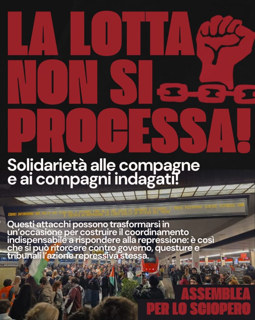 Ciò che vogliamo sottolineare non sono tanto i tecnicismi della procedura e del codice penale — richiamati solo per chiarezza — quanto il dato politico: in quelle piazze eravamo migliaia, decine di migliaia. Se nella rete repressiva sono rimasti coinvolti poco più di una decina di compagni e compagne, è necessario che tutte e tutti coloro che erano al loro fianco si assumano la responsabilità della solidarietà e dell’attivazione necessaria a sostenerli.