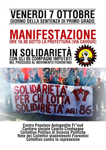 Venerdì 7 OttobreManifestazione:Solidarietà agli 86Leggi tutto »Venerdì 7 OttobreManifestazione:Solidarietà agli 86