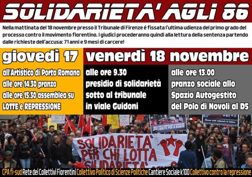 Nella mattinata del 18 novembre al Tribunale di Firenze é fissata l’ultima udienza del primo grado del processo contro il movimento fiorentino. I giudici procederanno quindi alla lettura della sentenza partendo dalle richieste dell’accusa: 71 anni e 9 mesi di carcere!